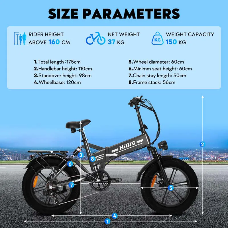 For enhanced safety and control, the bike features front and rear disc brakes and a Shimano 7-speed derailleur, allowing riders to easily adapt to different riding conditions. With a maximum load capacity of 150 kg, the E20 is built with a strong and durable frame to support various riding needs.