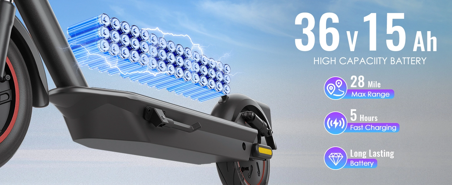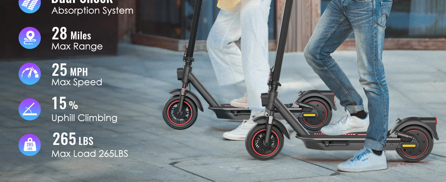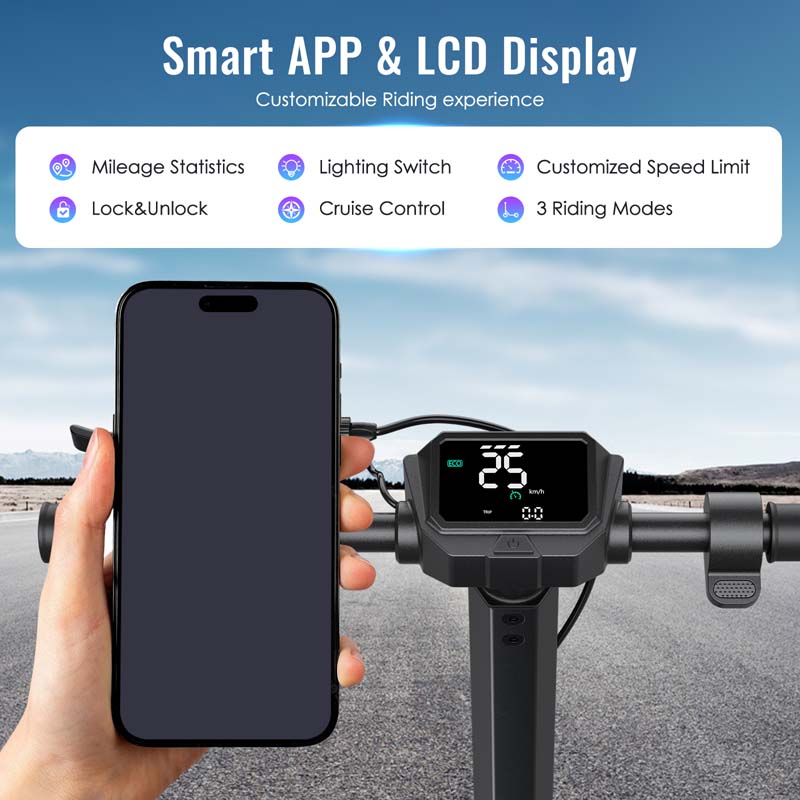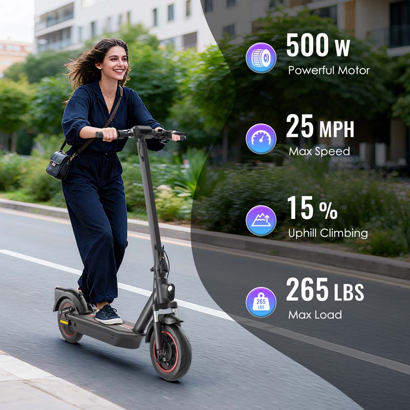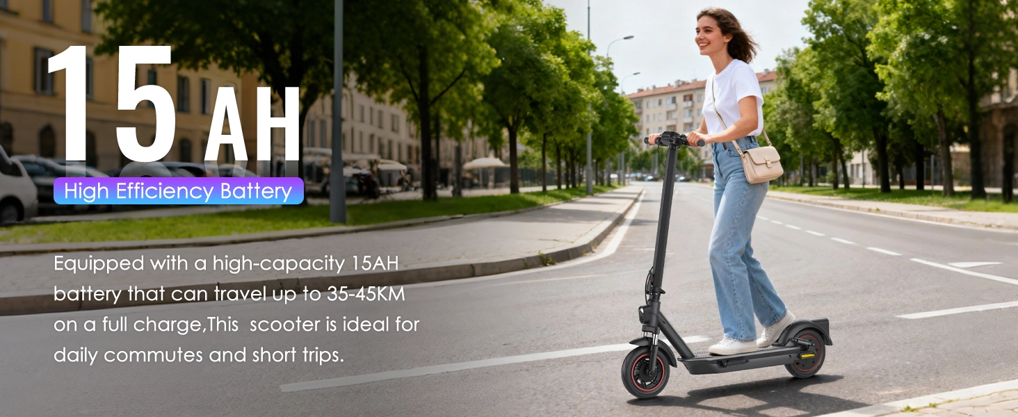 Equipped with 10-inch air tires, the MAX offers superior shock absorption and smoother rides over uneven surfaces. Its 600W high-performance motor and 36V 13/15Ah lithium battery provide a riding range of 35–50 km and a top speed of 25–40 km/h, making it ideal for daily commuting or leisure rides.