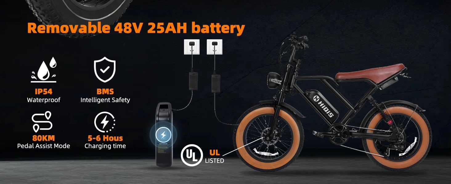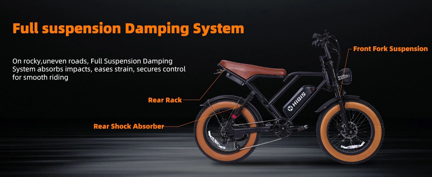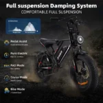 The high-capacity 48V 25Ah lithium battery delivers an extended riding range of 50–60 km per charge, making it suitable for long-distance rides and demanding outdoor adventures. Full suspension (front and rear) effectively absorbs shocks, ensuring a smooth and comfortable riding experience even on uneven surfaces.