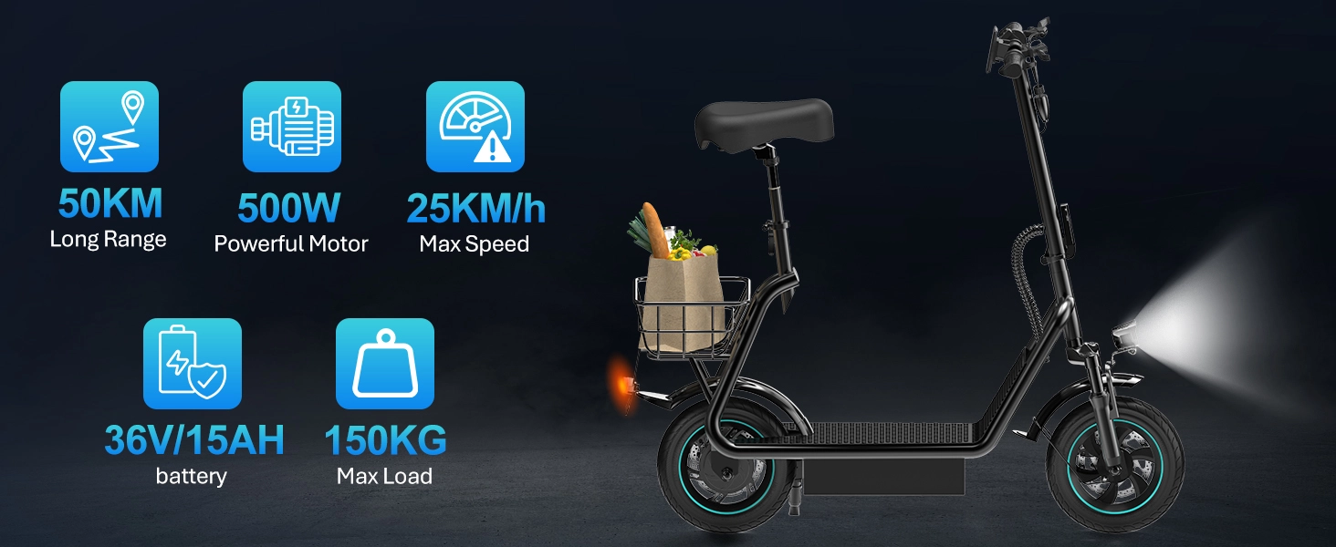 Featuring 10-inch air tires and a 600W high-power motor, the V12 PRO delivers smooth, stable rides even on uneven surfaces. Its 36V 15Ah lithium battery provides a riding range of 35–50 km, while the top speed of 25–40 km/h allows flexible use for urban streets or short-distance trips.