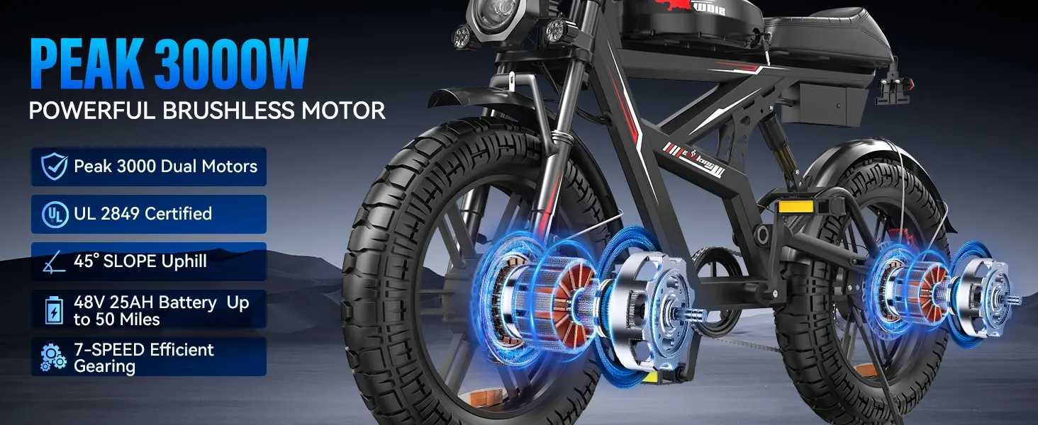 The WO18 fat tire electric bike is engineered for riders who demand extreme power and off-road capability. Featuring 2000W dual motors with front and rear wheel drive, it provides excellent traction, climbing performance, and stability on sand, gravel, snow, and uneven terrain.