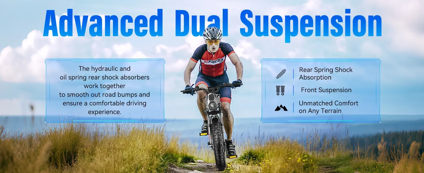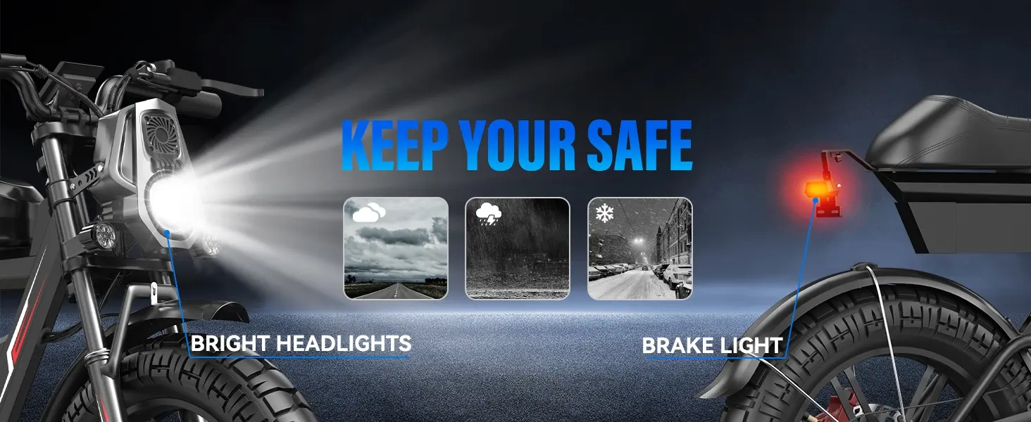 The 20×4.5 inch off-road fat tires ensure superior grip and shock absorption, while the front and rear suspension system enhances riding comfort on rough surfaces. Hydraulic disc brakes deliver strong and responsive stopping power for maximum safety.