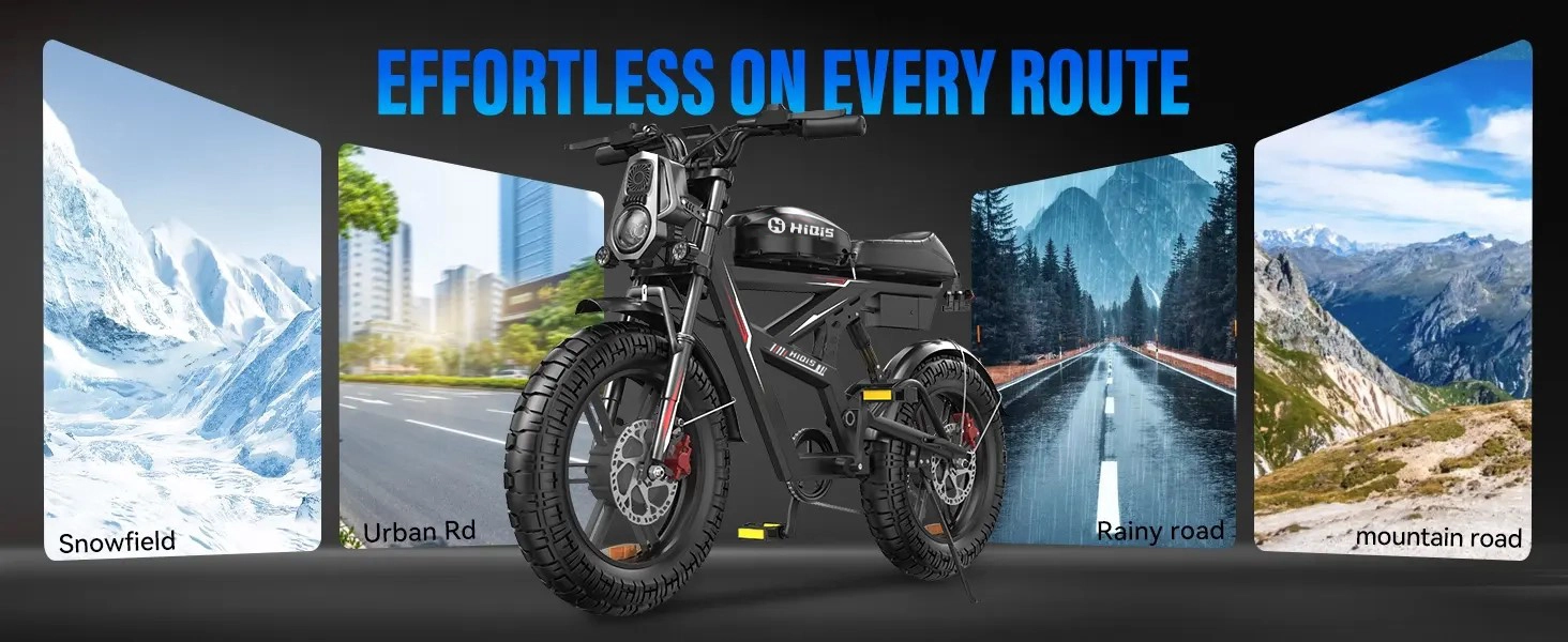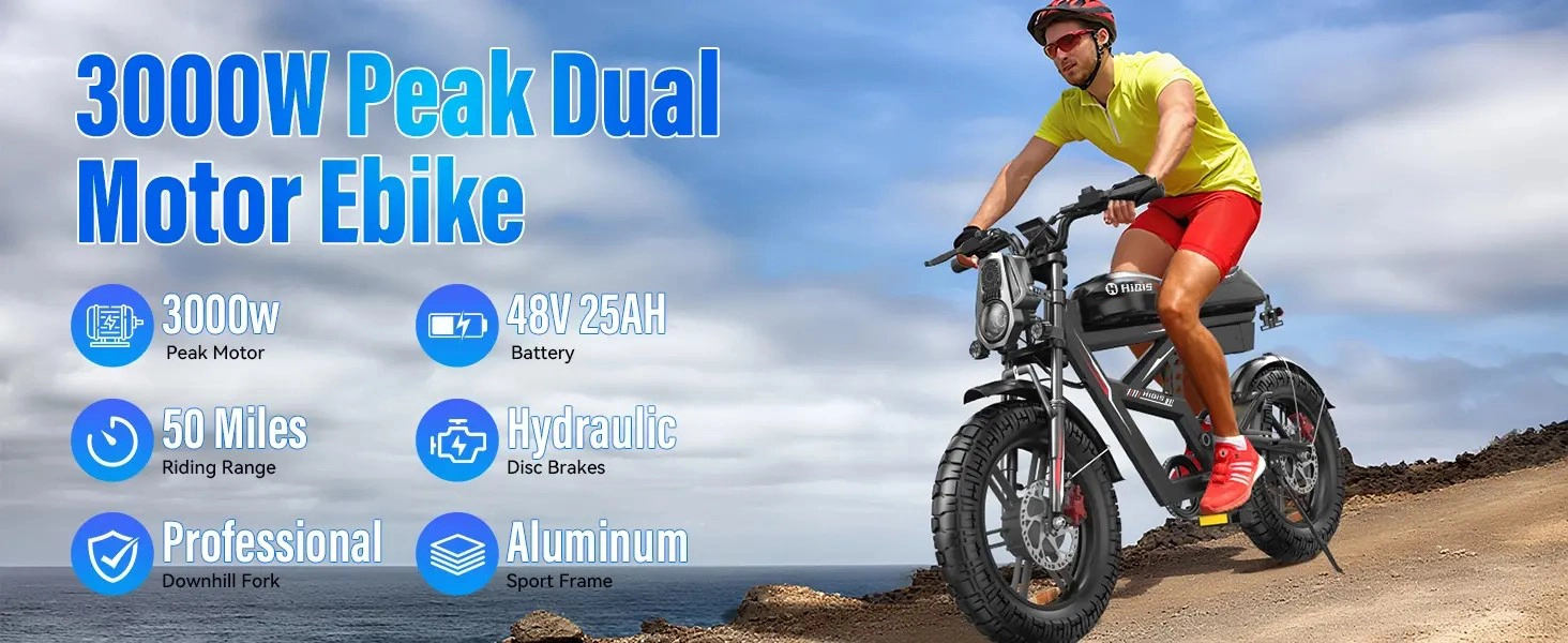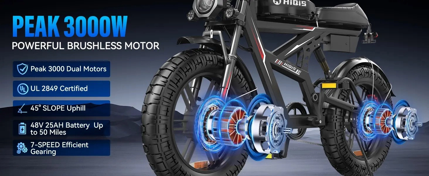 I bought this bike mainly for weekend rides outside the city and it’s honestly more powerful than I expected. The dual motors make a big difference when riding on gravel paths and small hills. It feels very stable with the wide tires. It’s definitely not a light bike, but that’s part of what makes it feel solid.